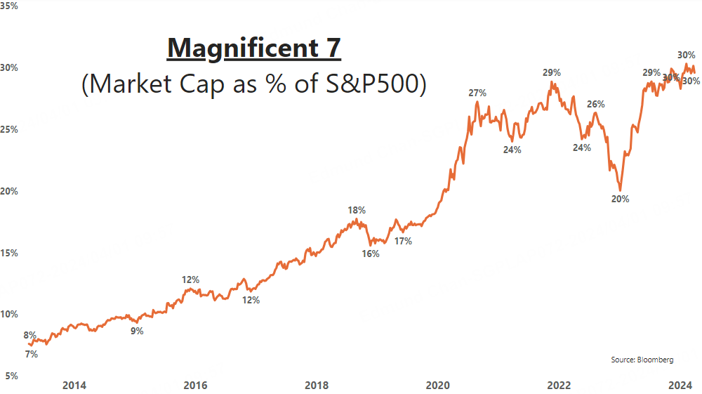 Additionally, the "Magnificent 7" tech giants now account for 30% of the S&P 500's market cap, the highest level in ten years.